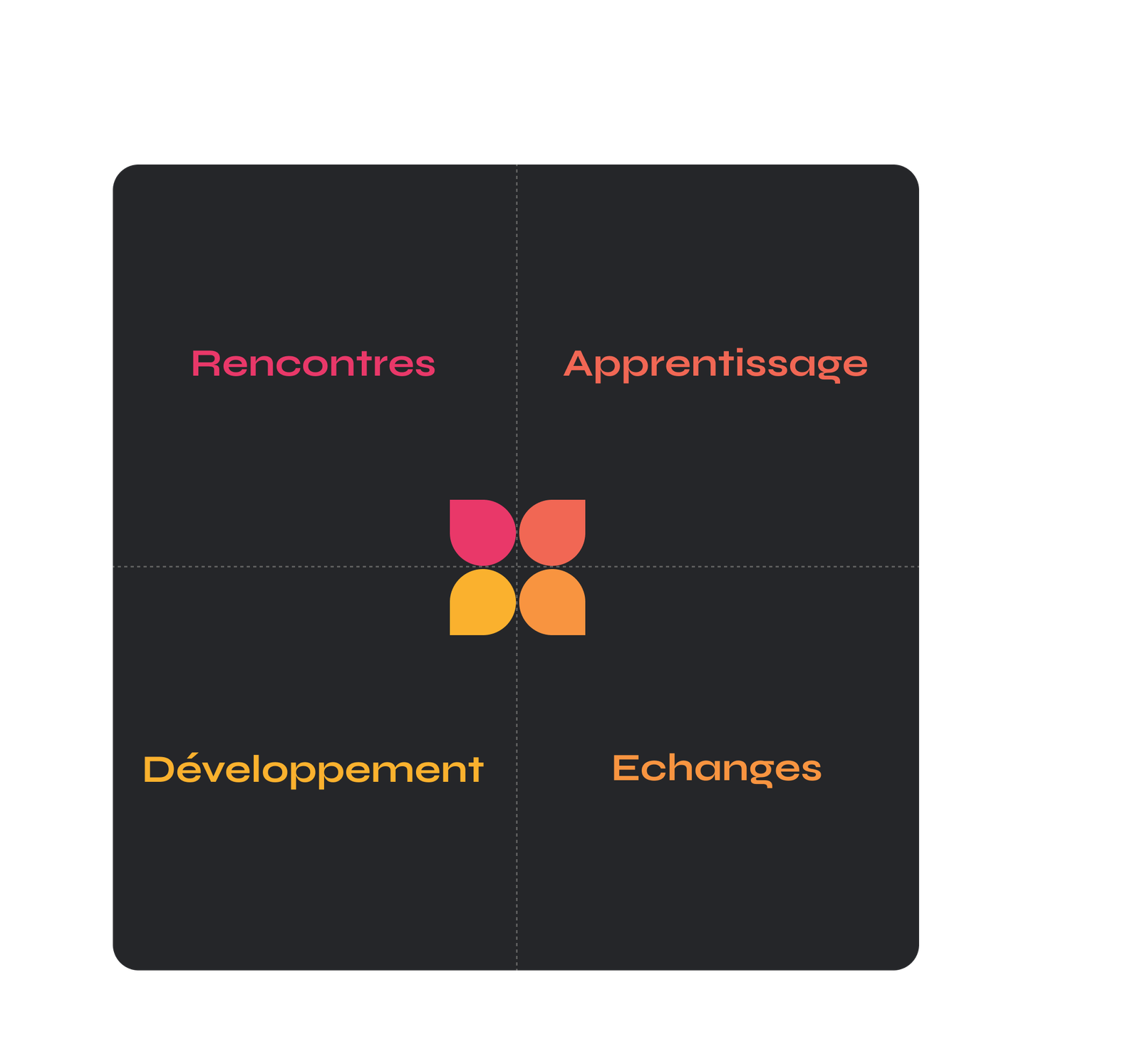 Ce carré repose sur quatre piliers : apprentissage, échanges, rencontres, et développement.